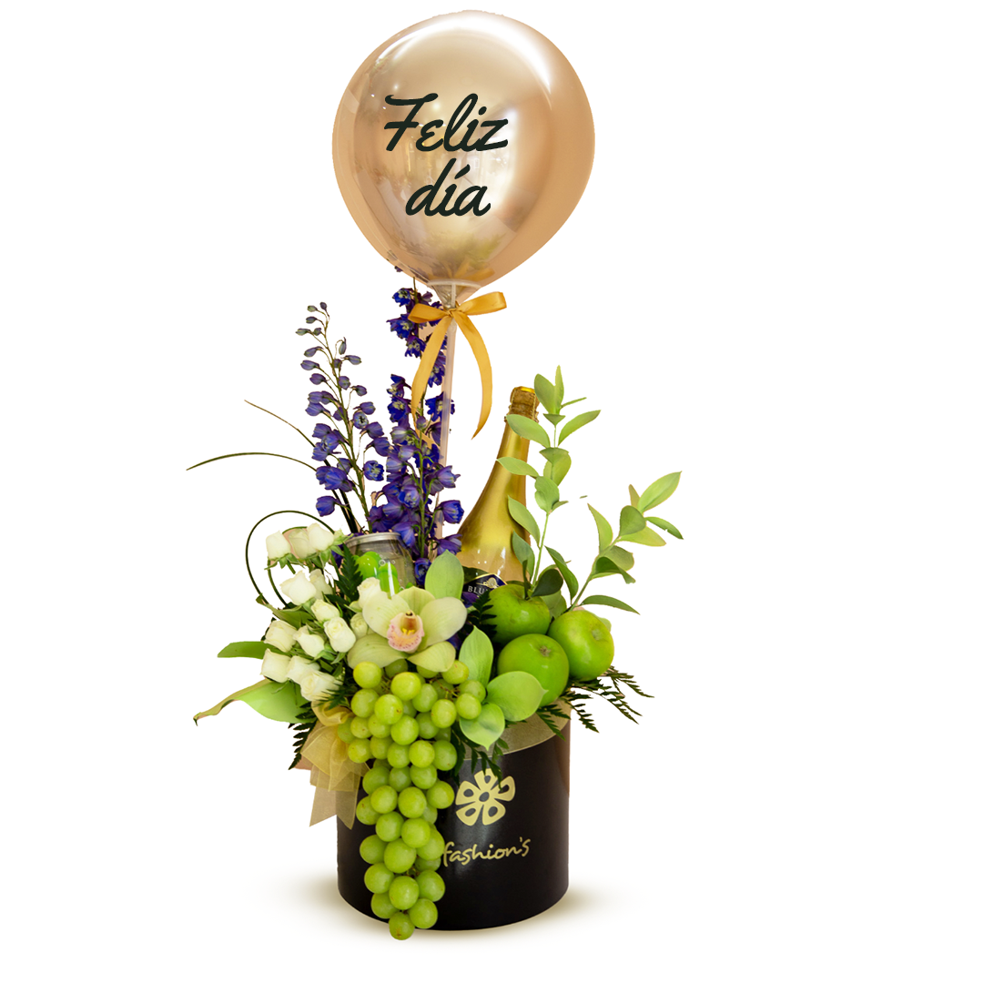 Arreglo floral en elegante base negra de madera en tonos verdes que contiene vino y frutas
