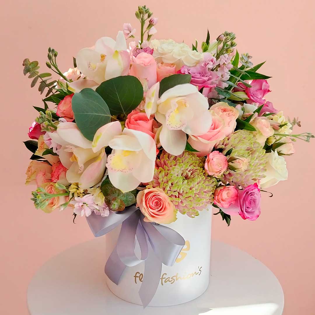 Delicado arreglo floral en tonos pasteles con orquídeas, rosas, alelí, cremones. Ideal para mamá