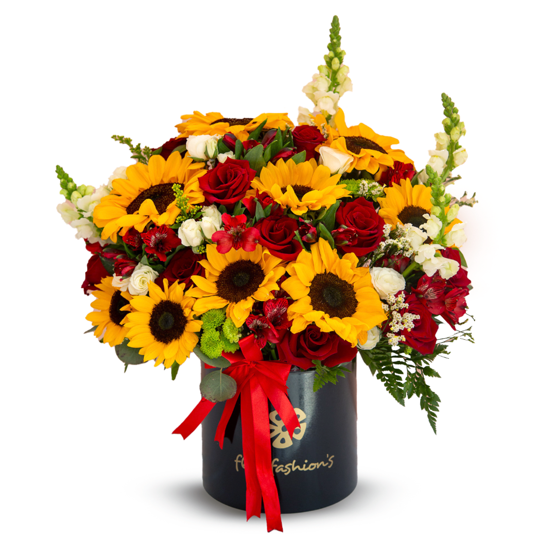 Arreglo floral elegante en caja de madera compuesto por rosas rojas y girasoles
